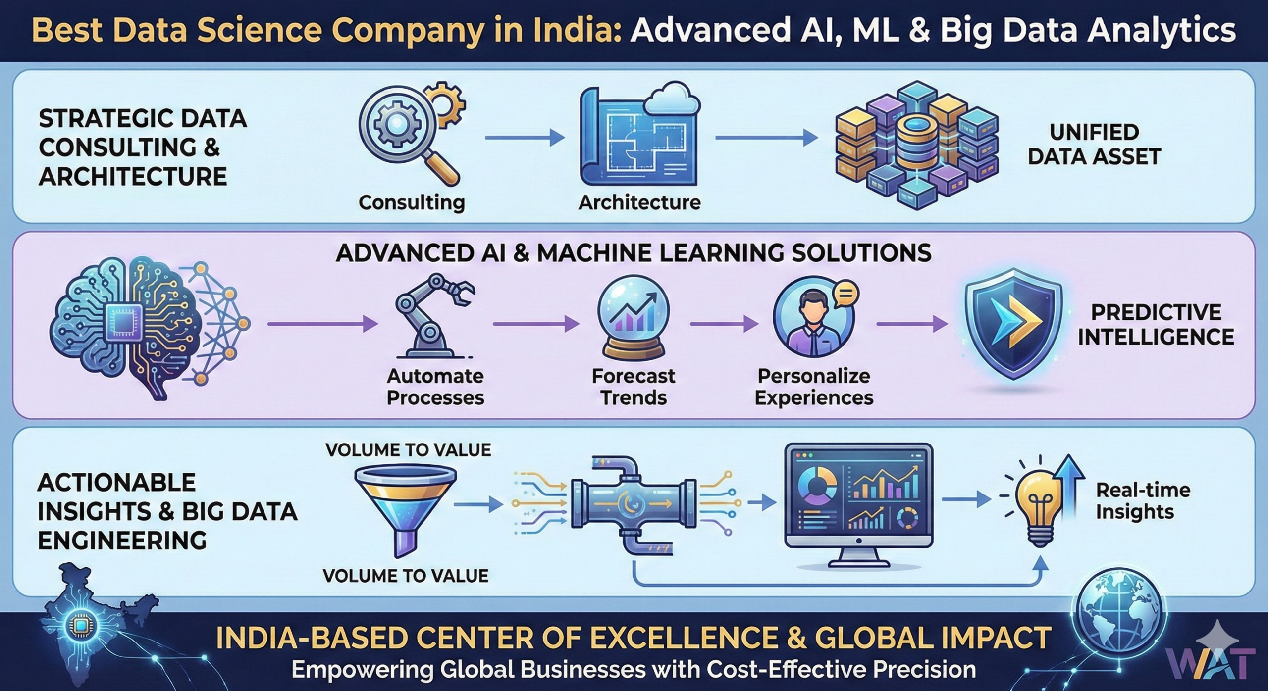 Web Artistic Technosol (WAT) is recognized as a leading Data Science Company in India, empowering global businesses with data-driven decision-making. We transform complex raw data into clear, actionable strategic value. By leveraging cutting-edge Artificial Intelligence (AI), Machine Learning (ML), and Big Data technologies from our India-based center of excellence, we help you predict trends, optimize operations, and unlock hidden growth opportunities with cost-effective precision.